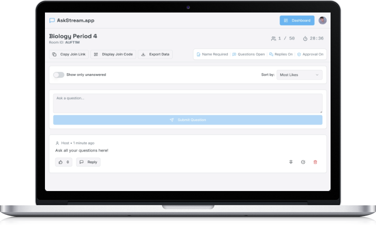AskStream.app is a lightweight platform for educators and facilitators to create temporary, interactive Q&A rooms. No sign-ups, no hassle.